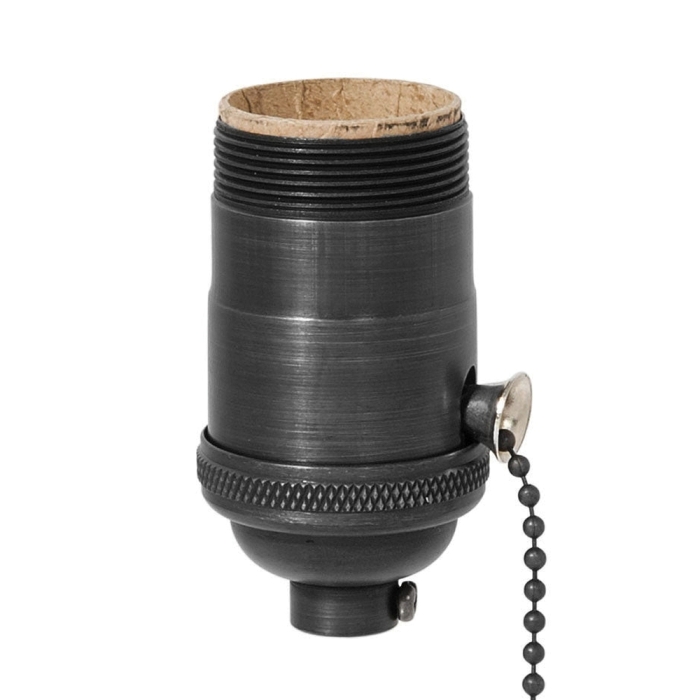 Satin black finish, high quality, pull chain U.L. listed lamp holders are specially designed for use in the manufacture and restoration of fine table and floor lamp lighting. Each style comes with a threaded cap and shell for superior strength and beauty. These are the lamp sockets of choice when mounting UNO fitter style lamp shades to bridge arm floor lamps. Pull chain style switch with on/off interior and UNO thread. Rated 660W-250V.