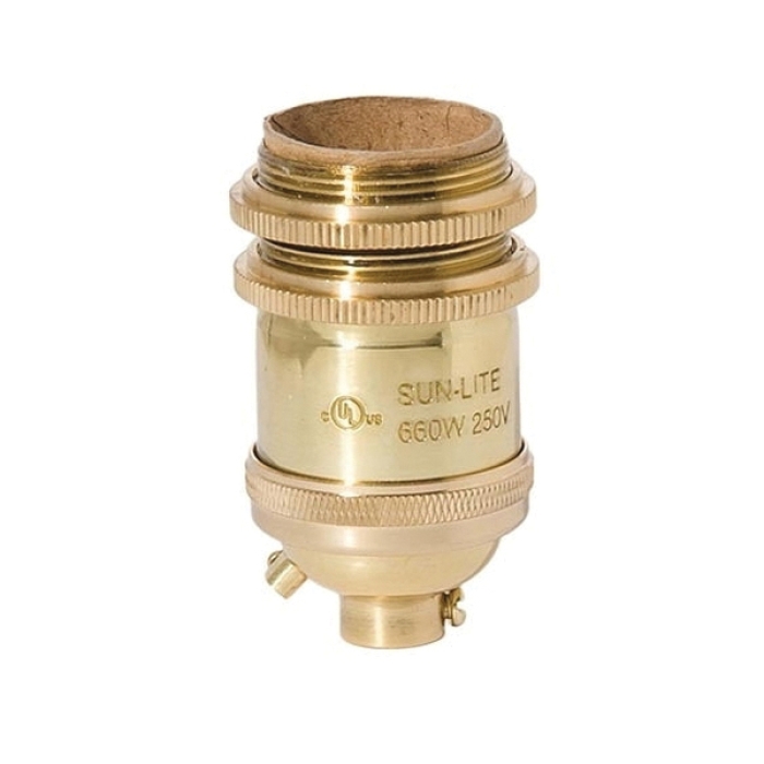 Heavy turned brass tall keyless socket with ground screw terminal, 660W-250V with set screw and extra long UNO threads, 1/8IP cap, comes with 2 uno rings, polished & lacqered finish