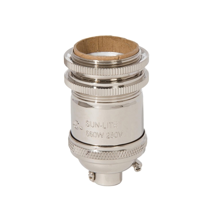 Polished nickel finish Sunlite brand full keyless heavy turned brass tall socket with ground screw terminal. E-26 (medium/standard) size socket.