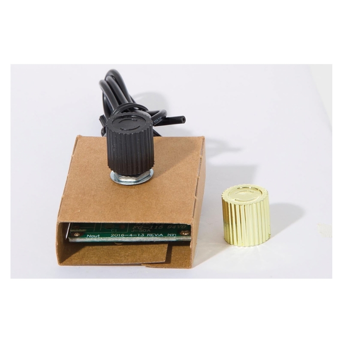 Turn-knob LED dimmer with paper houseing. For indoor use only. Comes with black and gold knobs. Dimmer measures 2" L x 1-5/8" W x 3/4" Ht. Dimmable LED 20W max, incandescent 100W max, 120V.