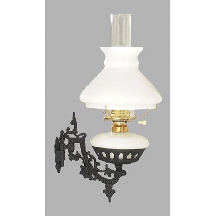 Iron wall bracket lamp with 7" fitter, USA hand blown opal glass shade and font. Extends 9 1/2" from wall. Electric.