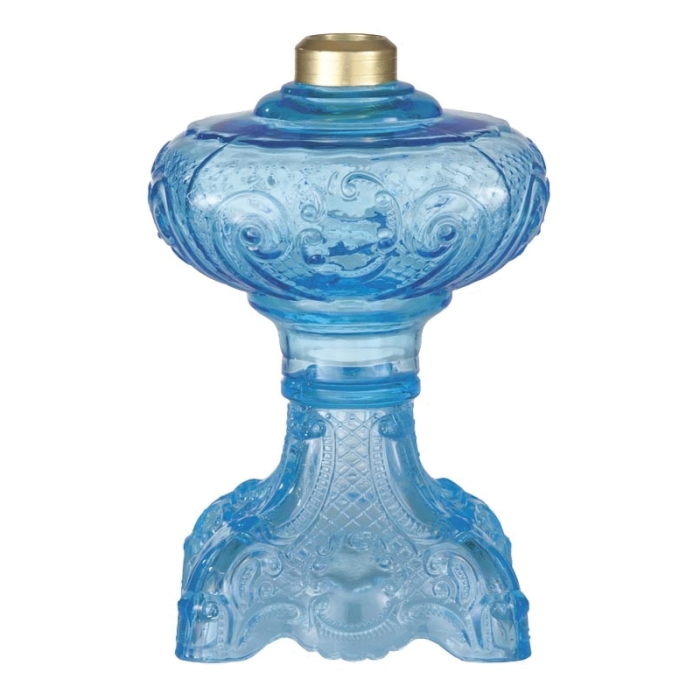 Light Blue Glass "Princess Feather" Oil Lamp Font is an exact replica of a Victorian era kerosene lamp. This "Princess Feather" pattern is very attractive and may represent the very height of Victorian styling during the kerosene era of lighting. 9 1/2" height., hand-blown, hand-made glass lamp.