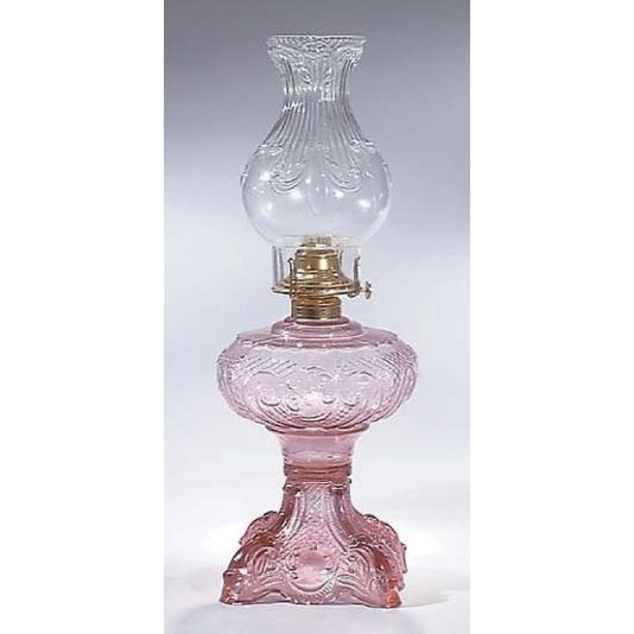 Princess Feather Pattern, Kerosene Lamp with Amber Glass Font Princess Feather Pattern, Kerosene Lamp w/Embossed Clear Glass Chimney, solid brass "Queen Anne" burner, and cotton wick. 19" ht. In terms of charming form and funtional reliability, this kerosene lamp is made like just the ones of the Victorian pre-electric era with hand-blown glass components and high quality brass burner. Your choice of font (base) glass color