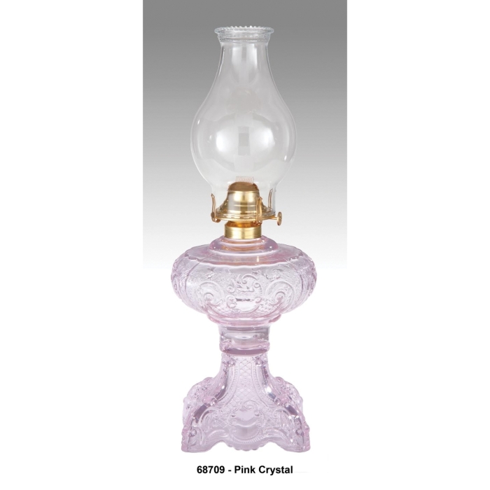 Light Blue Princess Feather Hand blown "Princess Feather" pattern oil lamp with solid brass #2 Queen Ann oil burner, beaded top Beaded top chimney. 20 inch height. Large capacity font holds up to 40oz. of kerosene.