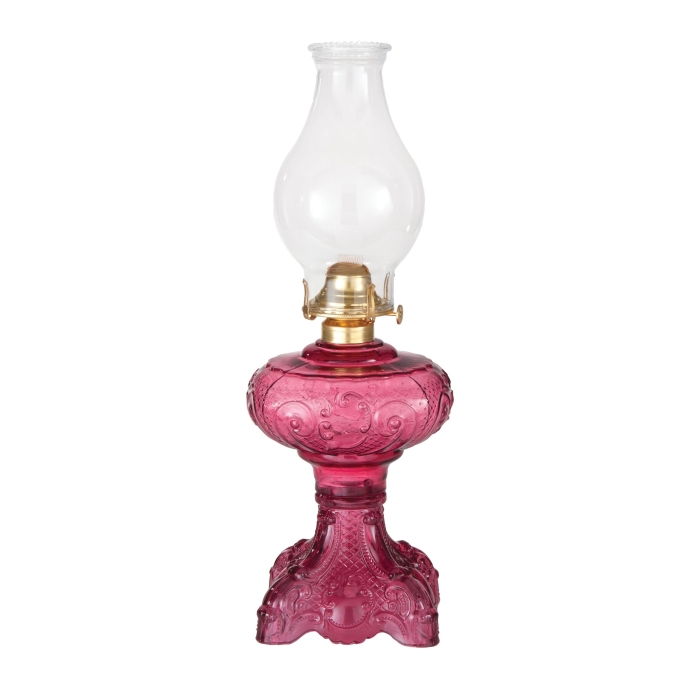Pink Hand blown "Princess Feather" pattern oil lamp with solid brass #2 Queen Ann oil burner, beaded top Beaded top chimney. 20 inch height. Large capacity font holds up to 40oz. of kerosene.