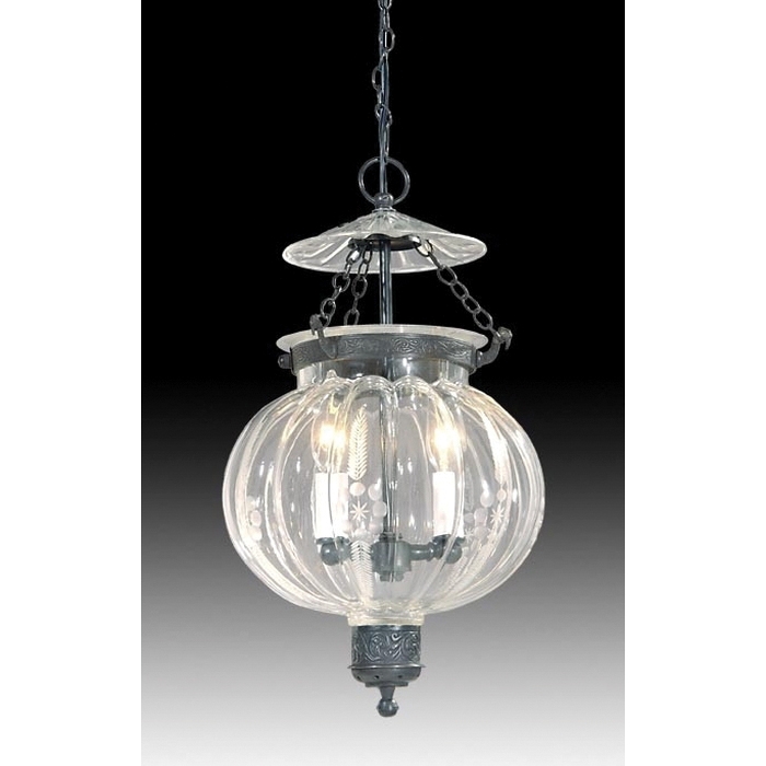 New England design Hall Lantern with copper wheel cut "Wheat" design glass dome and antique brass finish hardware which includes a cast brass canopy and chain. Clear 9 1/2" x 9" deep dome (shade) and adjustable ceiling drop from 19" to 40". This size is recommended for 8ft to 9ft ceilings. UL Listed.