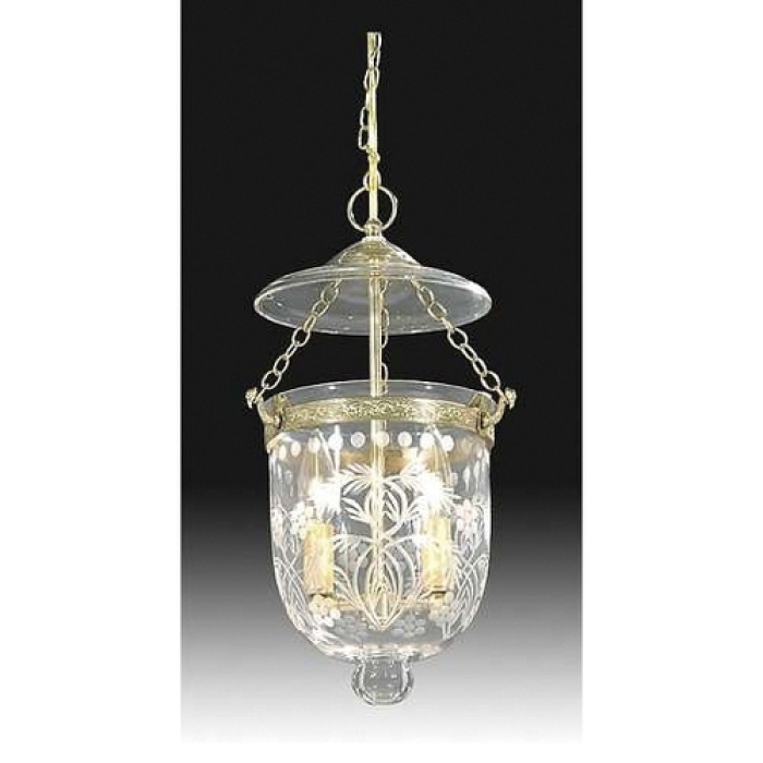 Tiny Hall Lantern with "Floral Foliate" copper wheel cut glass dome, 7" x 9 1/4" deep glass dome, adjustable drop from 20 1/2" to 39". Lantern includes a cast brass canopy and chain. This size recommended for 8' and 9' ceilings, Electric. UL Listed.