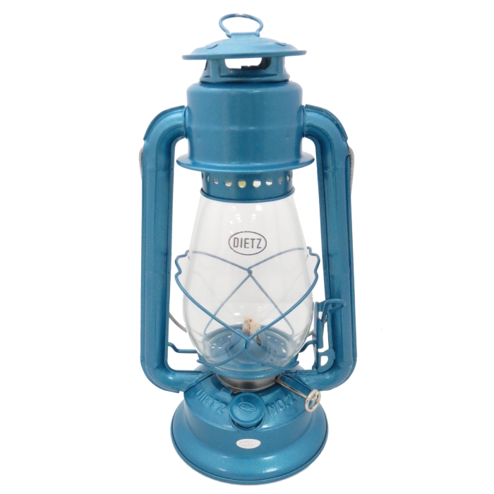 Blue Dietz Brand #20 Junior Lantern with glass chimney and steel burner. Measures 12 inches tall. Burns 12 hours on 9 ounces of fuel. 9 candle power output on a 5/8 inch wick.